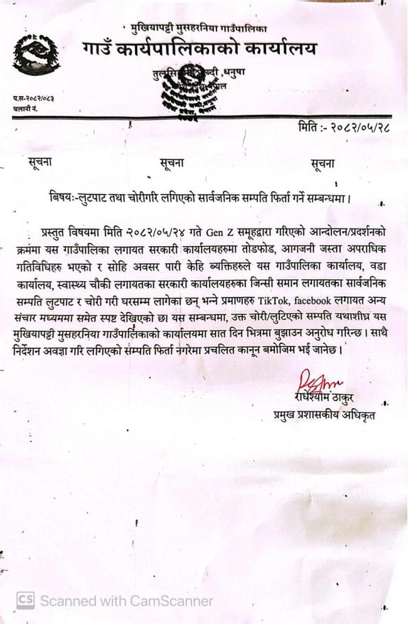 - लुटपाट तथा चोरीगरि लगेको सार्वजनिक सम्पति फिर्ता सम्बन्धमा ।