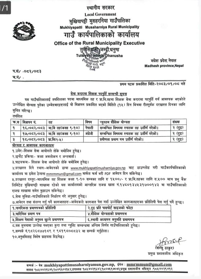 सेवा करारमा शिक्षक पदपूर्ति सम्बन्धी सुचना