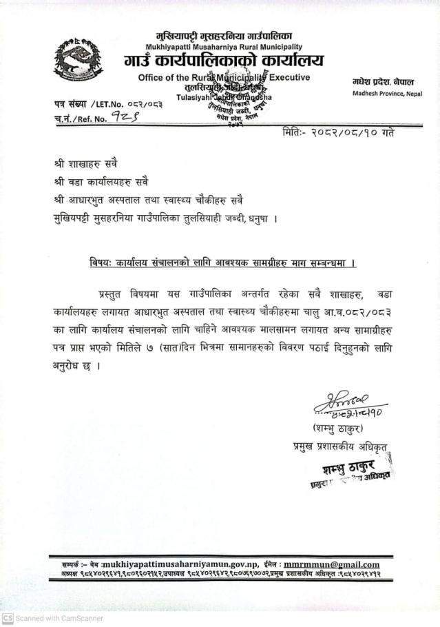 - कार्यालय संचालनको लागि आवश्यक सामग्री माग सम्बन्धमा